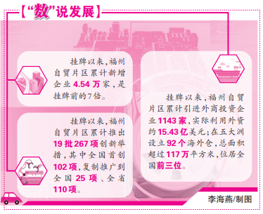 栽好梧桐树,自有金凤来。挂牌成立以来,福州自贸片区累计新增企业4.54万家,是挂牌前的7倍;创新推出19批267项创新举措,其中全国首创102项,复制推广到全国25项、全省110项,为全国、全省提供了许多可复制可推广的福州经验,为全市打造了营商环境优化标杆。