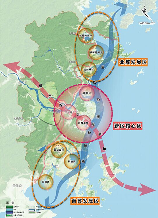 同时,按照组团式开发、集中连片发展的思路,在新区范围内规划了九个功能布局各有侧重的城市功能组团。其中,核心区800平方公里范围内规划三江口组团、闽江口组团、滨海新城组团、福清湾组团、江阴湾组团等五个城市功能组团,是近期新区开发建设的重点区域。