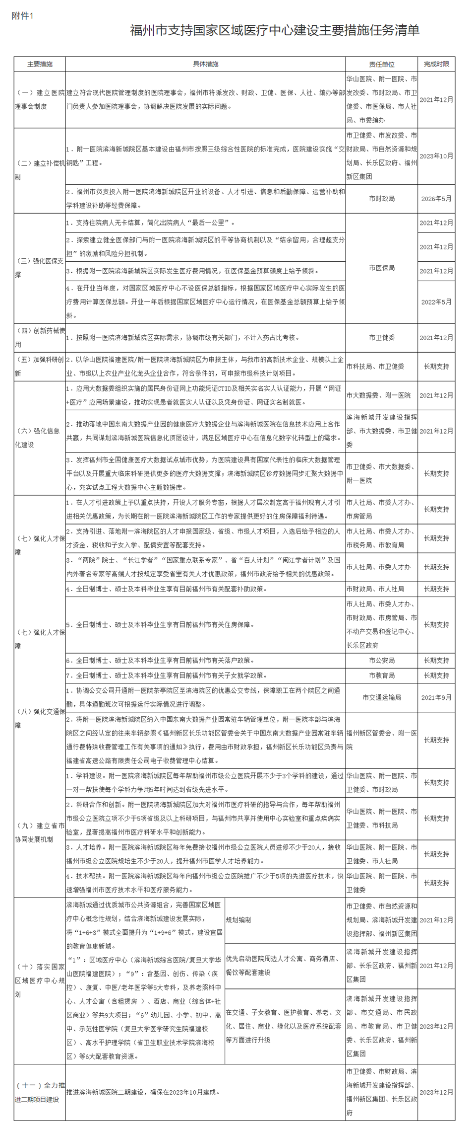 附件:1.福州市支持国家区域医疗中心建设主要措施任务清单