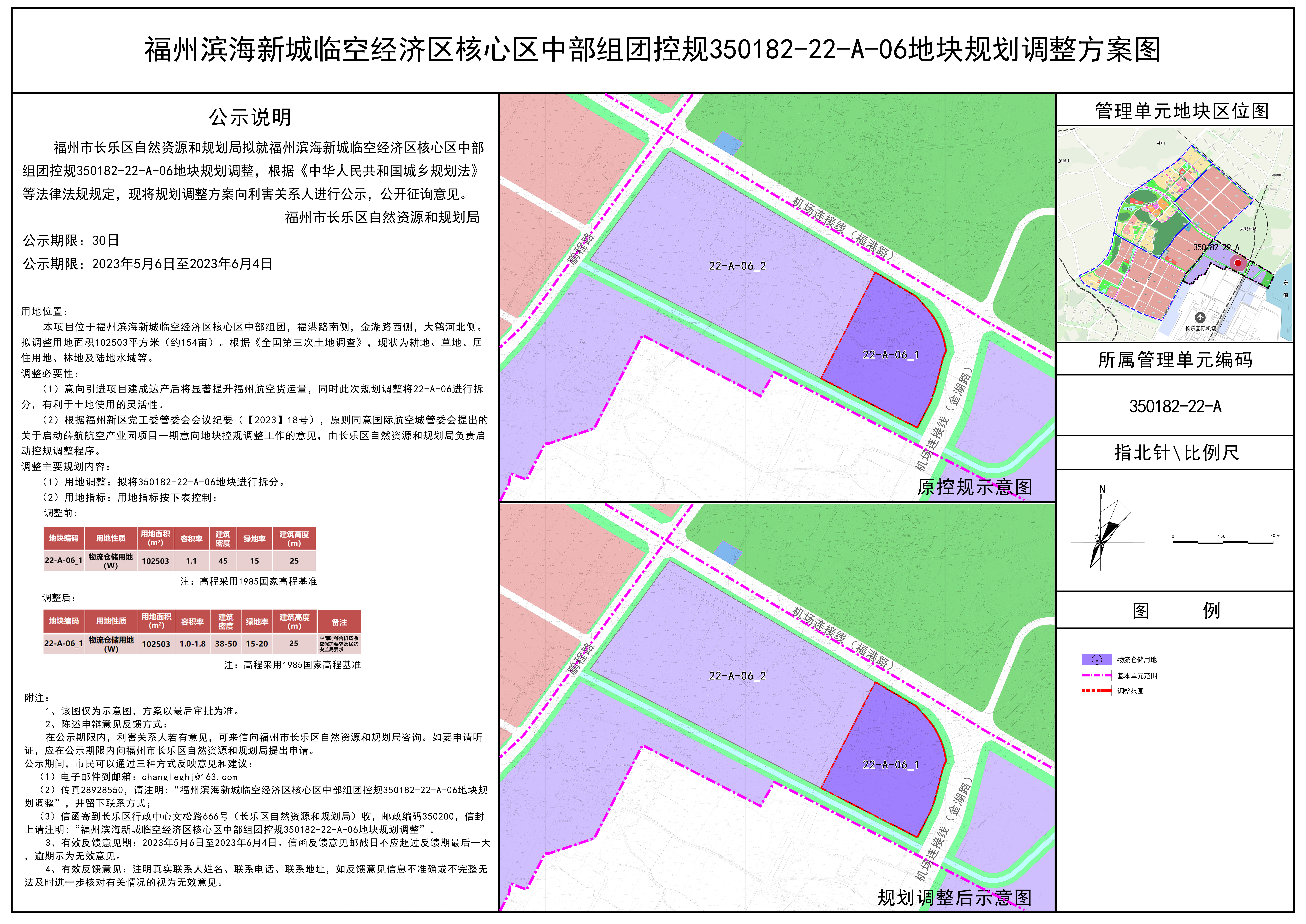 福州滨海新城临空经济区核心区中部组团控规350182-22-A-06地块规划调整的公告