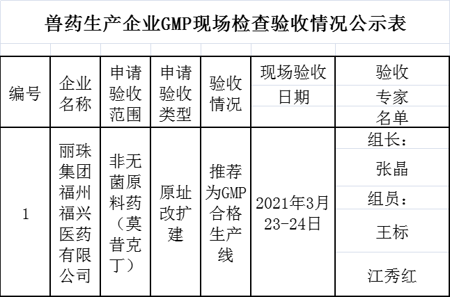 根据《兽药生产质量管理规范》的规定,依照农业部第2262号公告公布的《兽药生产质量管理规范检查验收办法》,根据市政府《福州市人民政府办公厅转发线上av 管委会关于承接121项省级经济管理权限实施方案的通知》(榕政办〔2016〕246号),按流程由福州市农业农村局派出专家组对以下1家企业实施GMP的情况进行现场检查验收。现将检查情况在线上av 官网上予以公示,公示时间为2021年4月12日至2021年4月30日(15个工作日),请将意见和建议反馈给线上av 管委会规划发展局行政审批处。