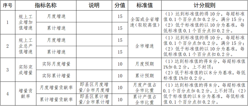 规上工业增加值增速(30分)、规上工业总产值增速(30分)、实际完成增量(20分)和增量贡献率(20分),每项考评指标均针对月度情况和累计情况分别设置二级指标。