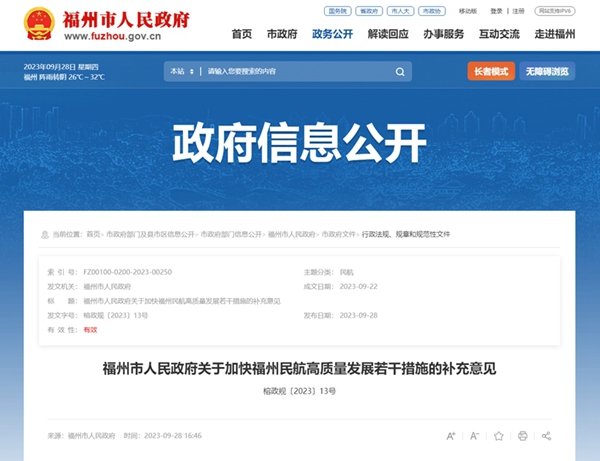 福州市人民政府关于加快福州民航高质量发展若干措施的补充意见