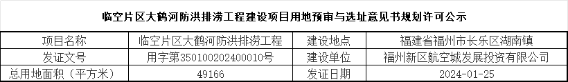 临空片区大鹤河防洪排涝工程建设项目用地预审与选址意见书规划许可公示