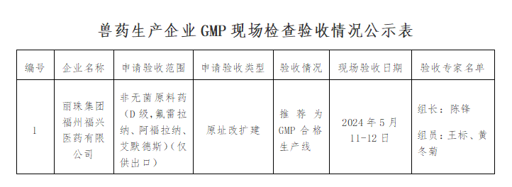 根据《兽药生产质量管理规范》的规定,依照农业部第2262号公告公布的《兽药生产质量管理规范检查验收办法》,根据市政府《福州市人民政府办公厅转发线上av 管委会关于承接121项省级经济管理权限实施方案的通知》(榕政办〔2016〕246号),按流程由福州市农业农村局派出专家组对以下1家企业实施GMP的情况进行现场检查验收。现将检查情况在线上av 官网上予以公示,公示时间为2024年7月9日至2024年7月15日,请将意见和建议反馈给线上av 管委会。