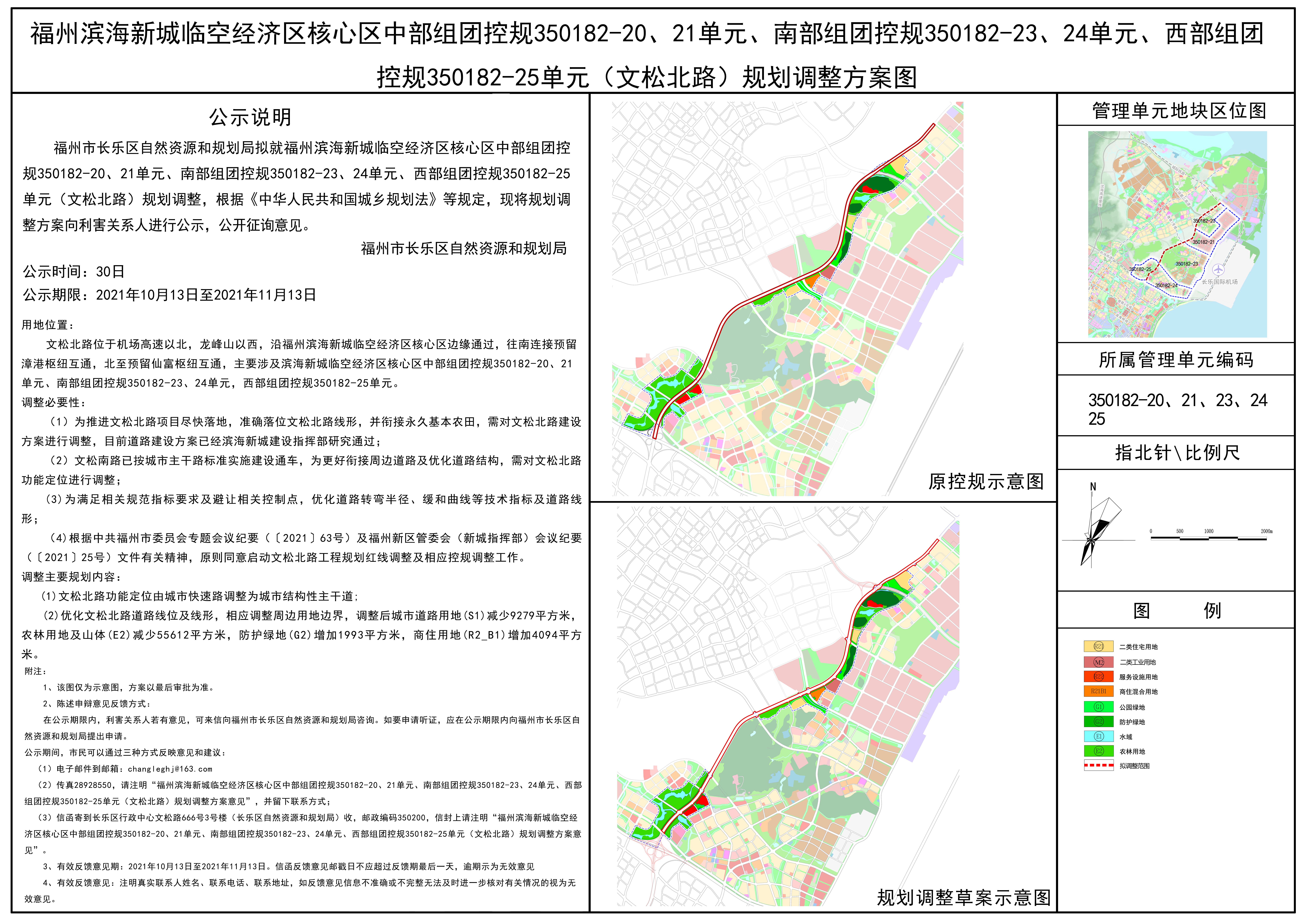 3、信函寄到长乐区行政中心文松路666号(长乐区自然资源和规划局)收,邮政编码350200,信封上请注明“关于福州滨海新城临空经济区核心区中部组团控规350182-20、21单元、南部组团控规350182-23、24单元、西部组团控规350182-25单元(文松北路)规划调整方案意见”。