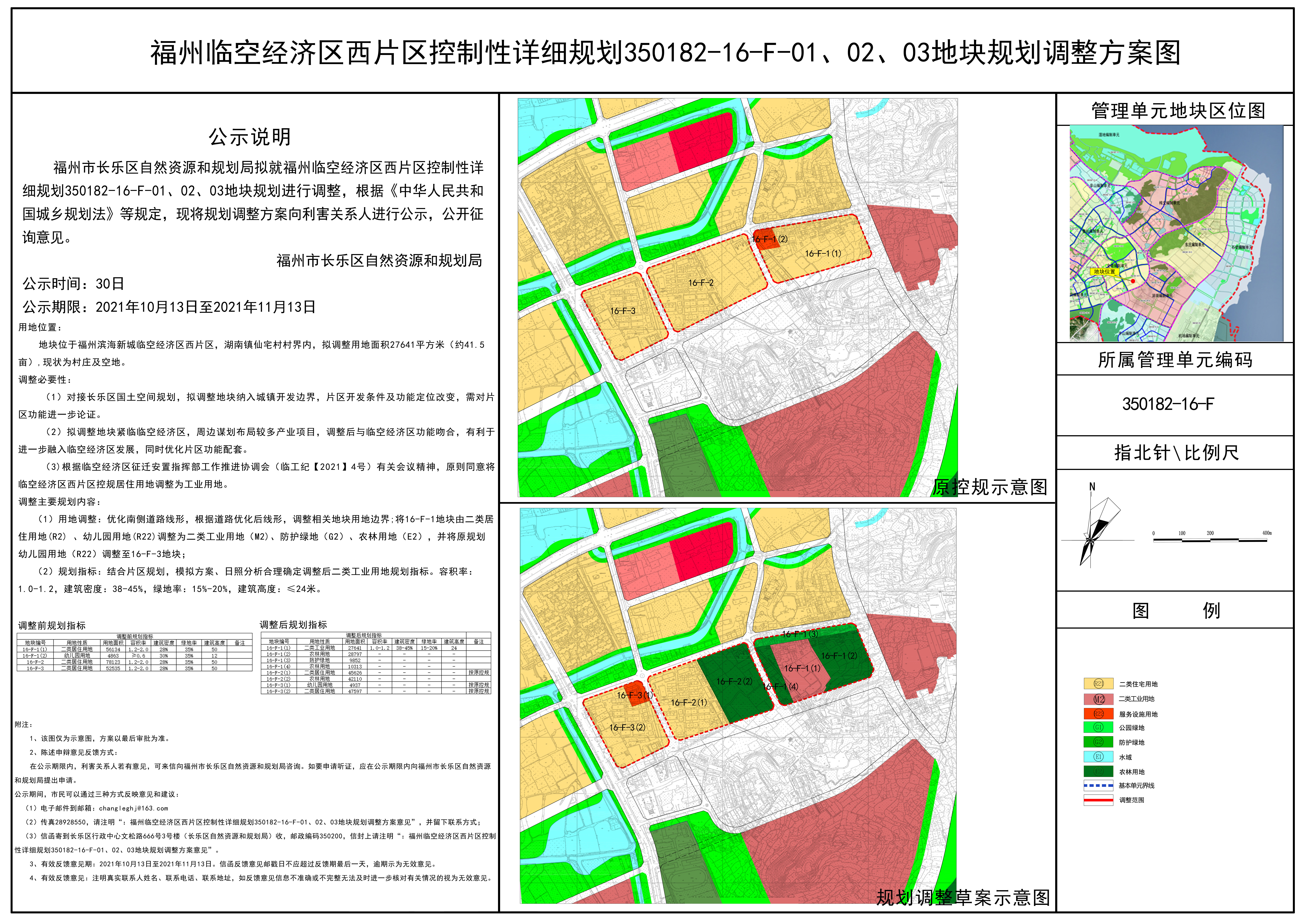 为有效盘活土地资源、壮大临空经济区产业发展,根据临空经济区征迁安置指挥部工作推进协调会(临工纪【2021】4号)文件精神,将位于福州滨海新城临空经济区西片区控制性详细规划350182-24-F-01地块,由居住用地调整为工业用地。现区自然资源和规划局已按程序启动控规调整,于2021年9月27日通过专家评审会。根据《城乡规划法》《福建省城市控制性详细规划管理暂行办法》及《福州市人民政府办公厅关于进一步规范规划用地管理的实施意见》(榕政办〔2020〕29 号)文件,现公告如下: