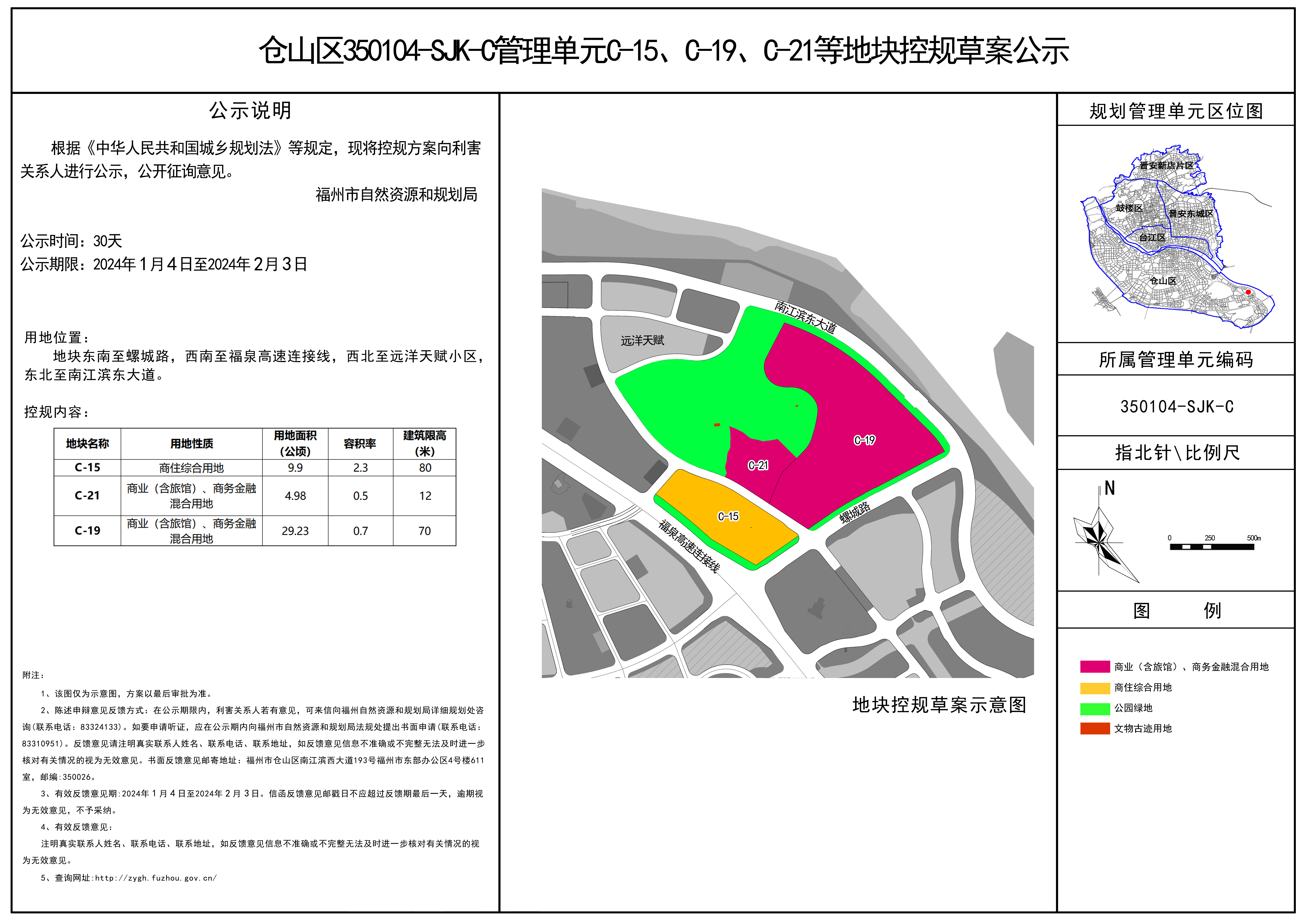 仓山区350104-SJK-C管理单元C-15、C-19、C-21等地块位于三江口片区沿江中部,东南至螺城路,西南至福泉高速连接线,东北至南江滨东大道。该控规草案经研究审议,根据《中华人民共和国城乡规划法》等相关规定,现征求利害关系人意见,公示时间2024年1月4日至2024年2月3日,详情可查阅网站(//zygh.xianshangav.com)。