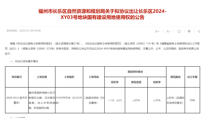 3月8日,长乐区自然资源与规划局发布“福州市长乐区自然资源和规划局关于拟协议出让长乐区2024-XY03号地块国有建设用地使用权的公告”。