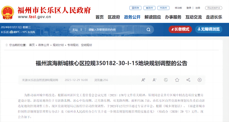 2023年12月29日,长乐区自然资源和规划局曾发布“福州滨海新城核心区控规350182-30-I-15地块规划调整的公告”。该地块即为本次协议出让的长乐区2024-XY03号地块。公告显示,原则同意壶井片区城中村改造项目安置房建设计划。新选址地块位于万新路北侧、冰心中街南侧、泛月路东侧,双龙路西侧,面积约36.7亩。
