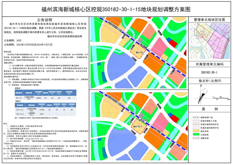 2.规划指标调整。30-I-15_1地块,用地面积21938平方米,容积率≤2.5,建筑密度≤25%,绿地率≥35%,建筑限高80米。建筑高度应同时符合机场净空保护要求及民航安监局要求。后续建筑设计需符合《福州轨道交通建设管理办法》的相关要求。