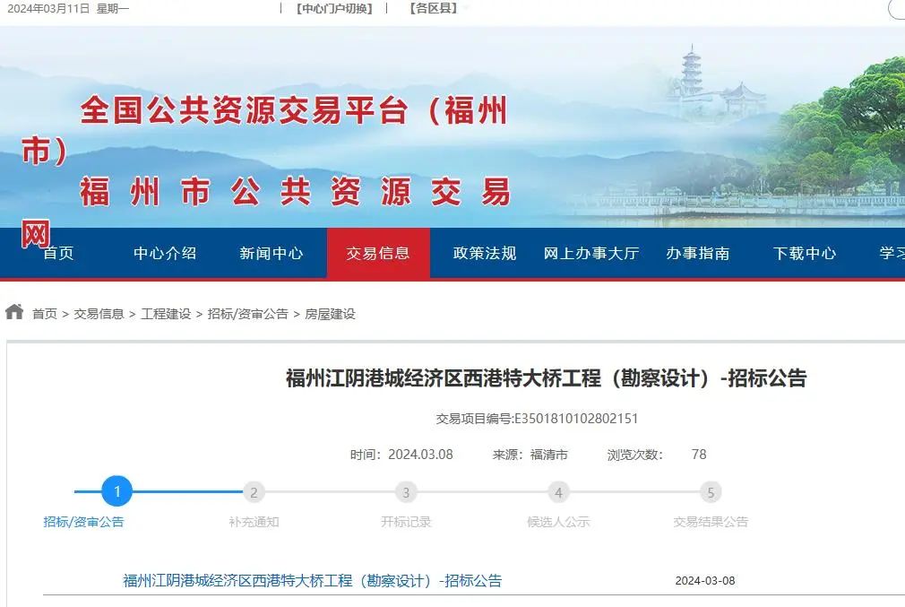 2024年3月8日,福州市公共资源交易服务中心发布“福州江阴港城经济区西港特大桥工程(勘察设计)(项目名称) 福州江阴港城经济区西港特大桥工程(勘察设计)标段勘察设计招标公告”。