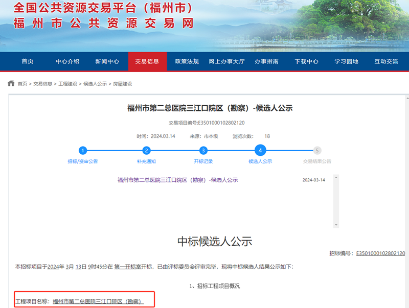 3月14日,全国公共资源交易平台(福州市)福州市公共资源交易网发布《福州市第二总医院三江口院区(勘察)-候选人公示》。公示显示本招标项目于2024年3月13日9时45分在第一开标室开标,已由评标委员会评审完毕。
