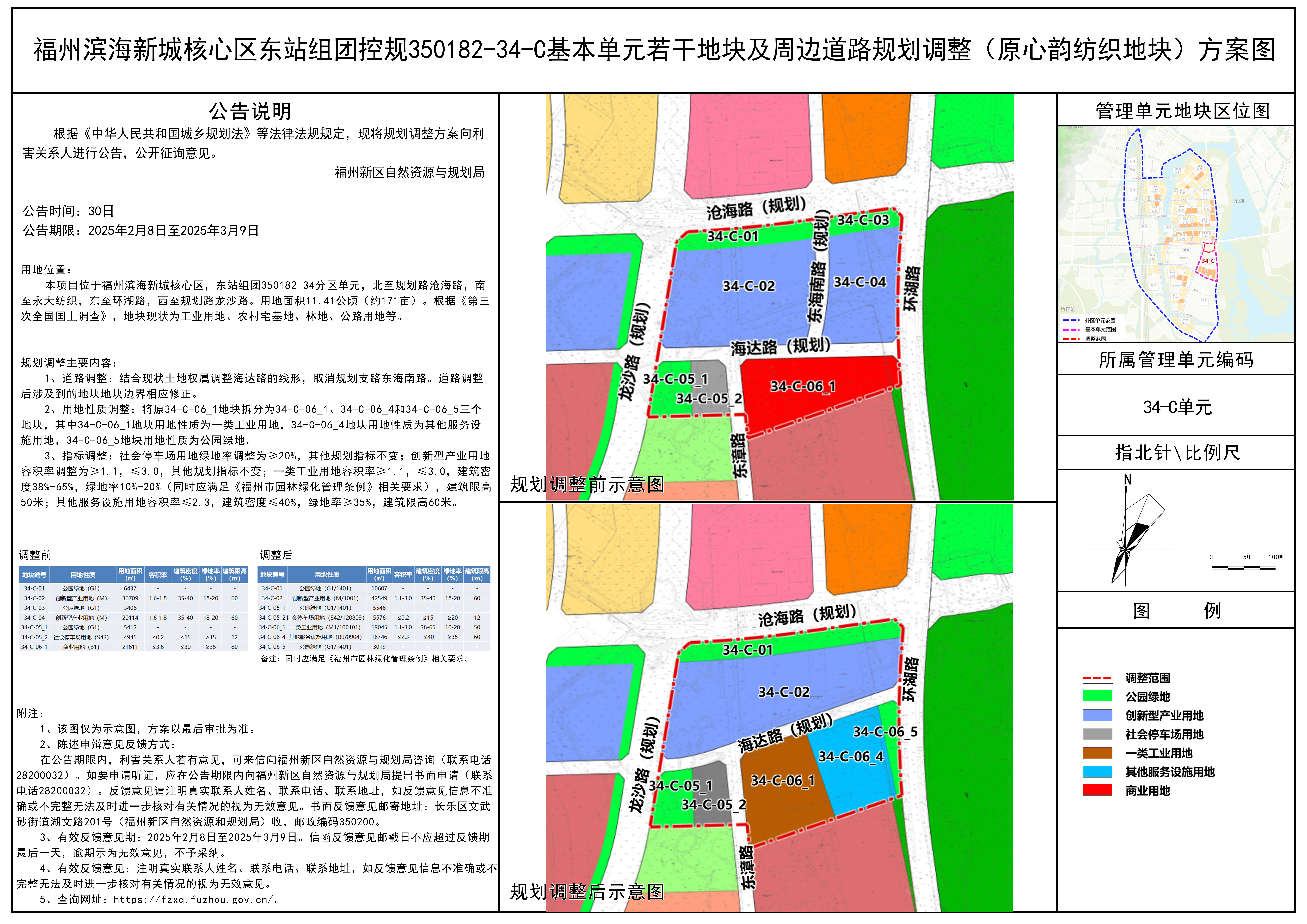 用地调整:将原34-C-06_1地块拆分为34-C-06_1、34-C-06_4和34-C-06_5三个地块,其中34-C-06_1地块用地性质为一类工业用地,34-C-06_4地块用地性质为其他服务设施用地,34-C-06_5地块用地性质为公园绿地。