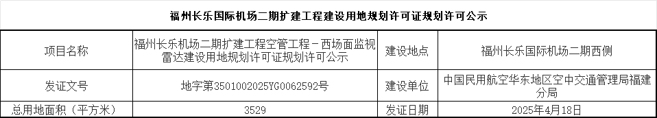 福州长乐机场二期扩建工程空管工程-西场面监视雷达建设用地规划许可证规划许可公示