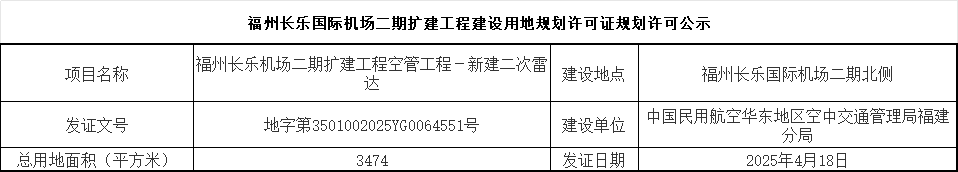 福州长乐机场二期扩建工程空管工程-新建二次雷达建设用地规划许可证规划许可公示