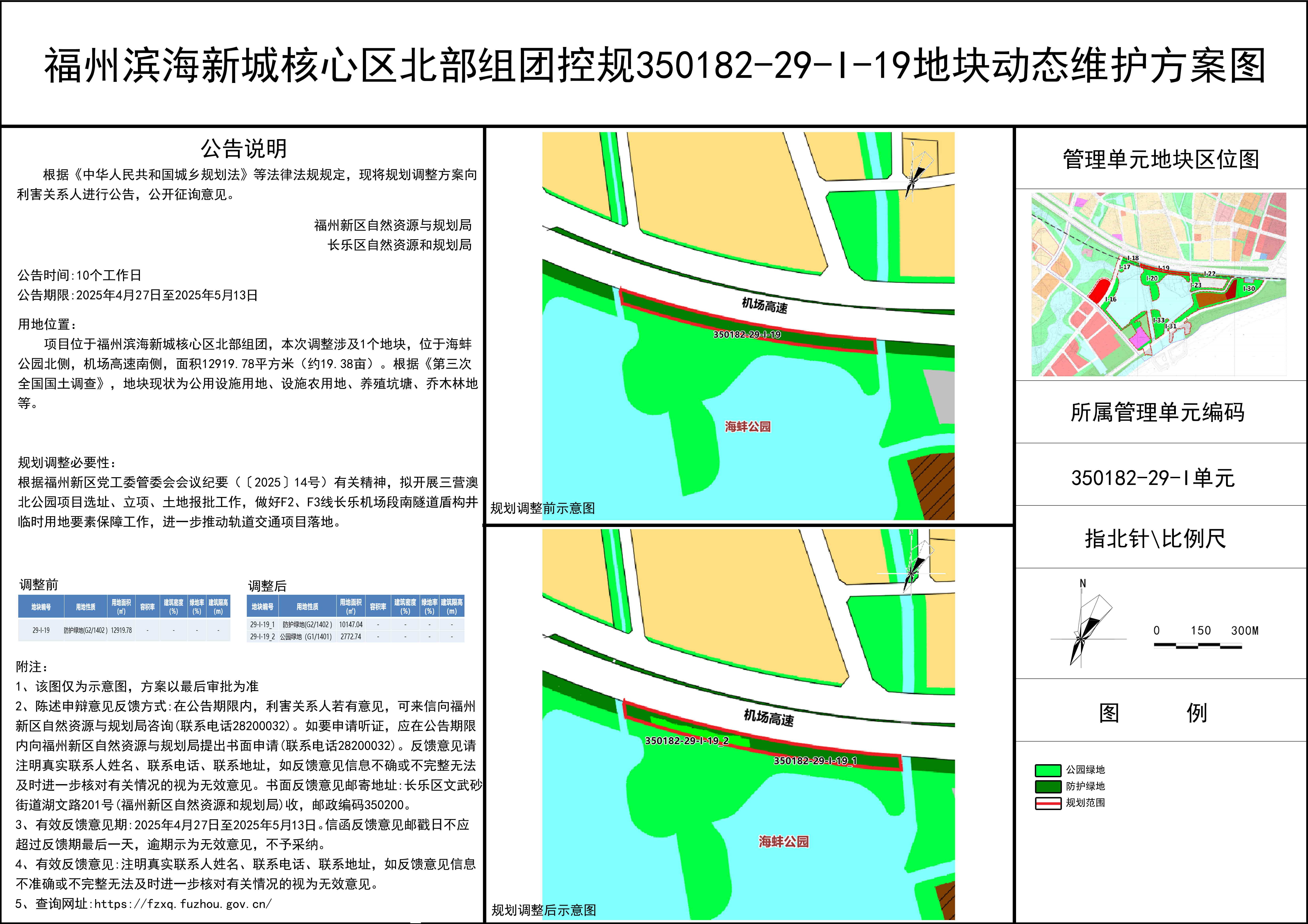 用地功能调整:地块调整后用地划分为350182-29-I-19_1、350182-29-I-19_2两块用地;350182-29-I-19_1保持原控规防护绿地用地(G2/1402),面积10147.04平方米(约15.22亩);350182-29-I-19_2用地性质由防护绿地(G2/1402)调整为公园绿地(G1/1401),面积2772.74平方米(约4.16亩),规划指标维持原控规,绿地总量不变。地块参照防护绿地管控要求建设及管理,涉及高速公路30米建筑控制区应符合《公路安全保护条例》相关规定。