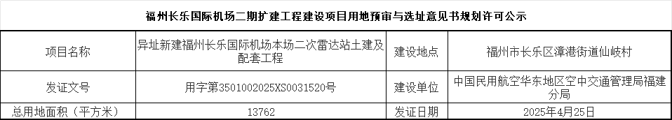 异址新建福州长乐国际机场本场二次雷达站土建及配套工程建设项目用地预审与选址意见书公示