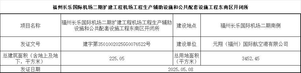 福州长乐国际机场二期扩建工程机场工程生产辅助设施和公共配套设施工程东南区开闭所批后公示