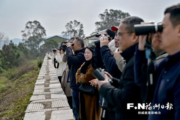 在闽江河口湿地,采风团成员使用望远镜观鸟。